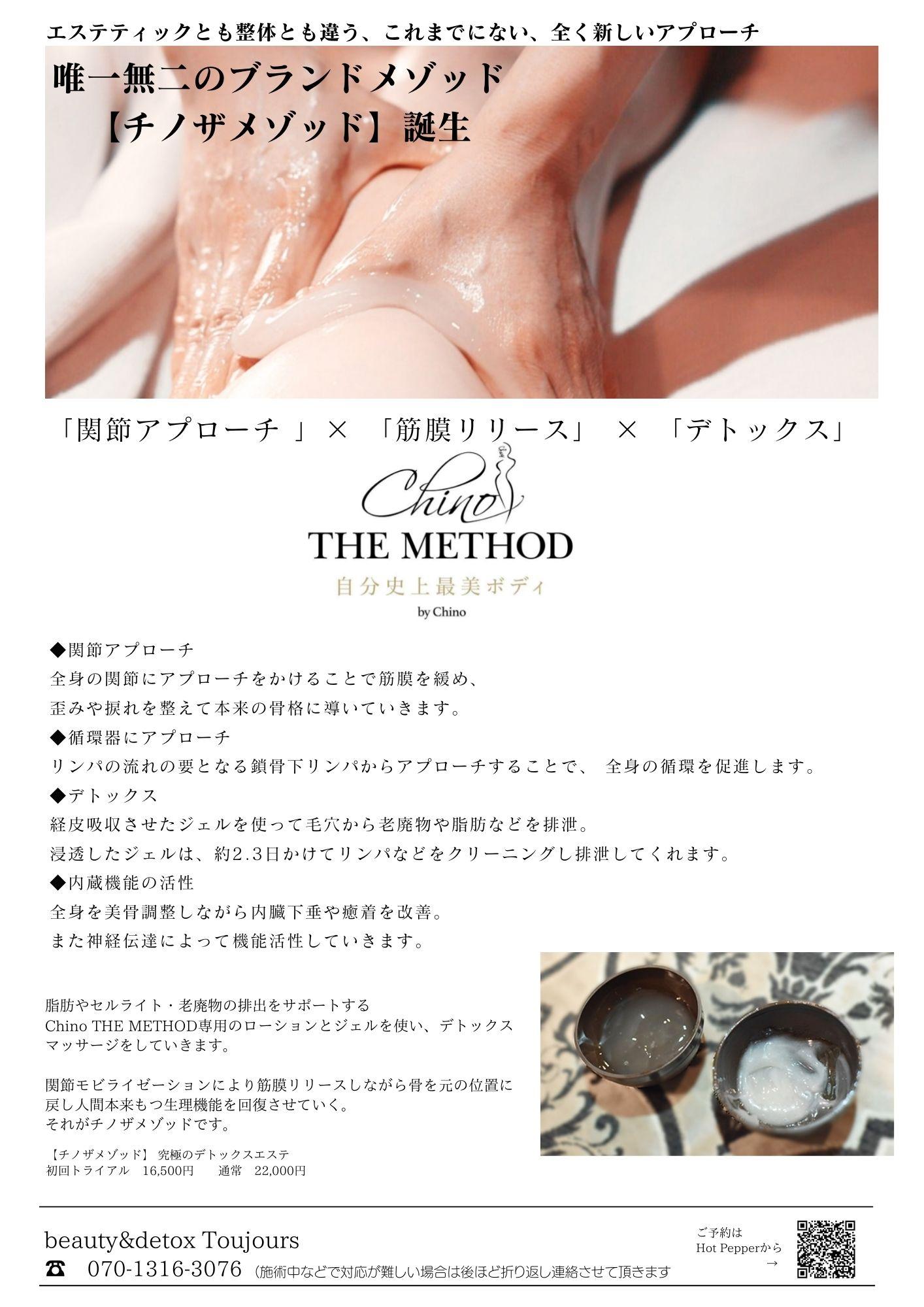 施術を受ける方の、生活習慣からくる体の癖や、不調に合わせて施術を行い リンパの流れの要である、鎖骨下のリンパにアプローチして循環を促進。各関節と筋肉を細かく丁寧に緩めて、歪んだ骨格を整えます。 同時にChino THE METHOD専用ジェルを使って、老廃物と脂肪を排出させセルライトをなくし、内蔵機能を活性化させることで、リバウンドレスな美しいスタイルをつくり上げます。